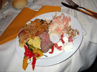 Dass es bei der ganzen Aktion nicht darum geht, irgendwo anzukommen, sondern irgendwo hinzufahren wird schnell klar, wenn man das Innere des Schiffs betrachtet. Dad Buffet ist etwas größer als das gesamte Appartment, in dem ich lebe (hier nur ein Ausschnitt, der auf meinen Teller passt)